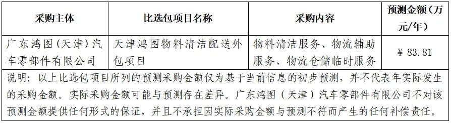 广东鸿图(天津)汽车零部件有限公司(以下简称天津鸿图或比选方)现计划对物料清洁配送外包项目进行比选采购。我们诚挚邀请具备较强实力、丰富经验及良好商业信誉的服务商伙伴(以下简称参选单位、参选方或参选人)参与此次比选采购。比选按打包形式进行,将物料清洁服务、物流辅助服务、物流临时服务三大业务进行组合打包,相关事宜公告如下: