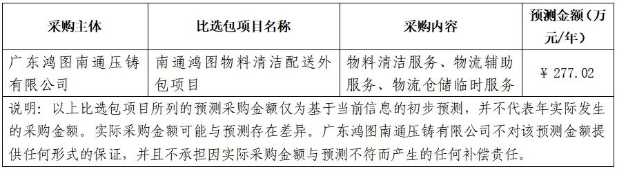 广东鸿图南通压铸有限公司(以下简称南通鸿图或比选方)现计划对物料清洁配送外包项目进行比选采购。我们诚挚邀请具备较强实力、丰富经验及良好商业信誉的服务商伙伴(以下简称参选单位、参选方或参选人)参与此次比选采购。比选按打包形式进行,将物料清洁服务、物流辅助服务、物流临时服务三大业务进行组合打包,相关事宜公告如下:
